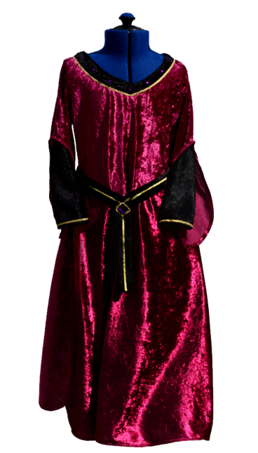 Morgana är hellång, sydd i vinröd krossad velour med delad ärm, underarmen svart med guldkant. Detaljer i vävt guld och handpåsydda lila stenar. Ett höftbälte följer med som är enkelt att ta på med kardborrband och som sitter fast baktill på klänningen i en hälla. Höftbältet är guldkantat med en större lila sten fastbroderad mitt fram.